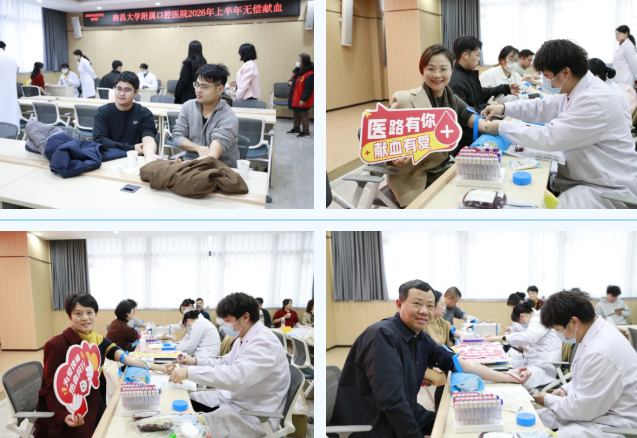 寒随冬去,春携雨来。为全面保障春季临床用血需求,2月27日上午,南昌大学附属口腔医院组织开展了2026年上半年无偿献血活动,本次献血活动以党支部为单位,党员干部率先垂范,充分发挥先锋模范作用,全院职工积极响应,58名员工成功献出爱心血液达13800毫升,为春天的寒意注入暖流。院纪委书记乐晟霁、省血液中心副主任徐思平到现场看望慰问参与献血的人员。