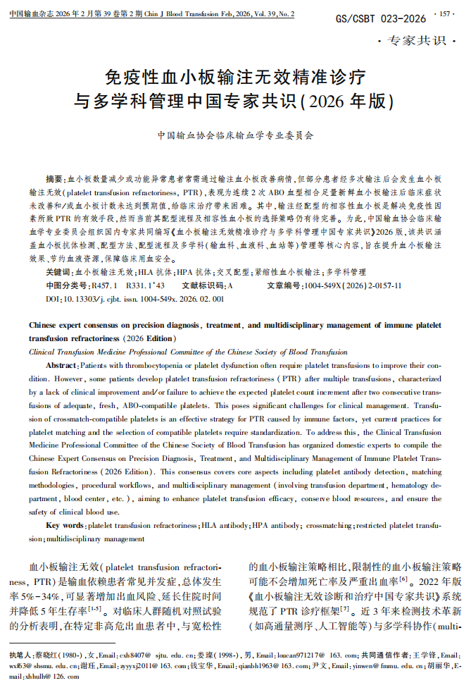GS/CSBT 023-2026 免疫性血小板输注无效精准诊疗与多学科管理中国专家共识(2026年版)