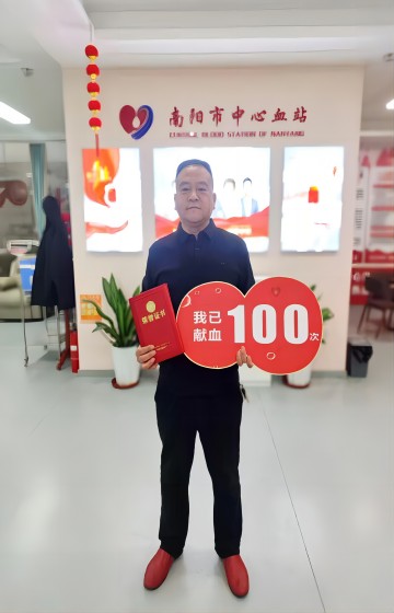 尹中立,是南阳宛东公交公司职工,从2000年7月21日第一次献血,到2025年12月23日完成第100次献血,14次全血捐献累计5600毫升,86次机采成分血达171个治疗量,每一组数字都镌刻着无私大爱。2025年8月,获得全国无偿献血奉献奖终身荣誉奖。他始终铭记初心:“无偿献血,为生命续航!” 平凡岗位上的不凡坚守,让热血成为连接你我的生命纽带。