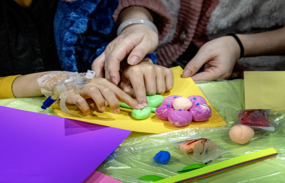 如果说分享是情感的交流,那么亲手制作便是心意的传递。在手工制作环节,志愿者们分工协作,指导孩子们制作黏土花束,并写下感恩贺卡。揉、捏、贴、粘……一朵朵小花在指尖绽放;贺卡上的字迹或许稚嫩,却满是真诚的祝福。病房里充满了欢声笑语,孩子们专注地为心中的“女神”准备礼物,也让这个节日增添了亲手创作的温度。