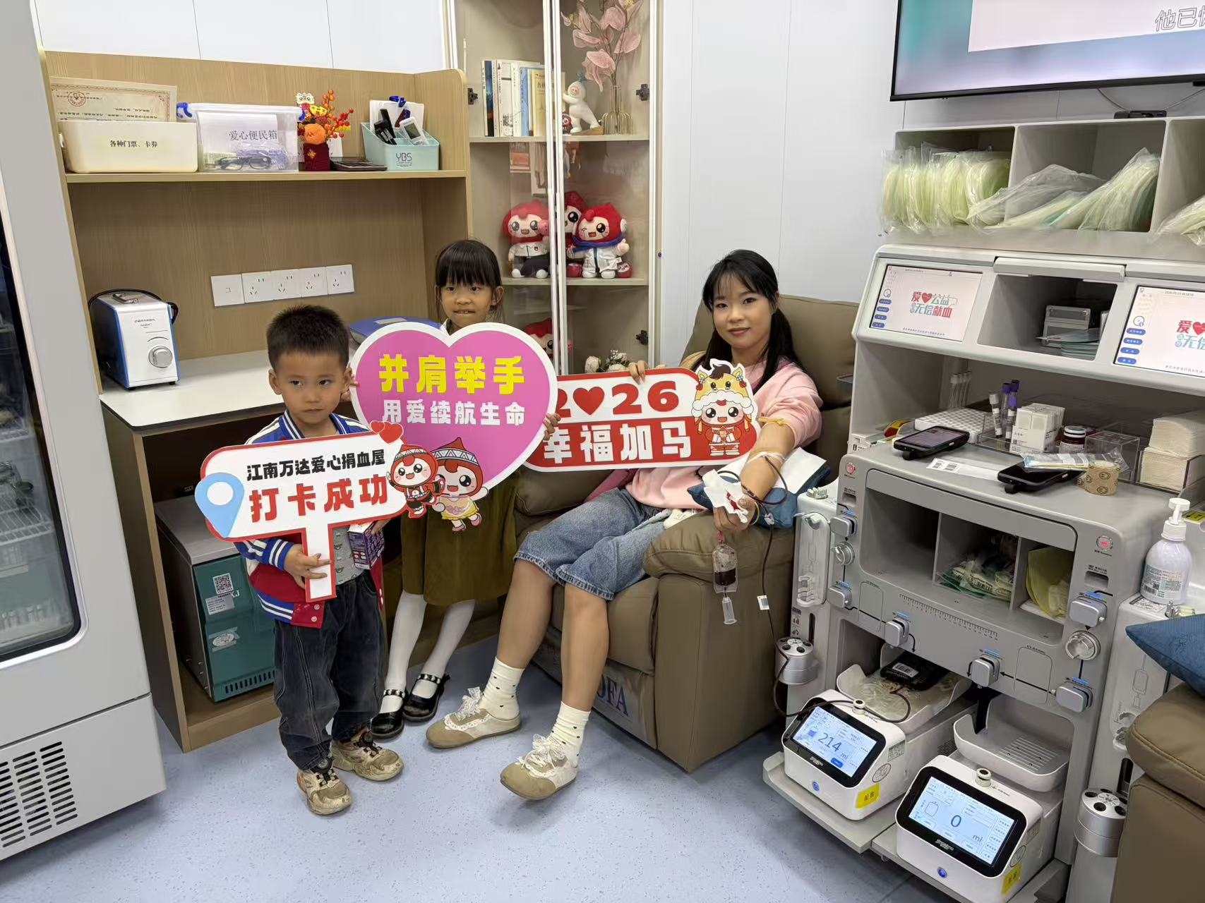 2026年3月15日,爱心市民叶芯蓉女士带着一双儿女走进江南万达捐血屋,顺利捐献全血400毫升,用实际行动诠释奉献的意义,也为孩子们的心中种下公益的种子。