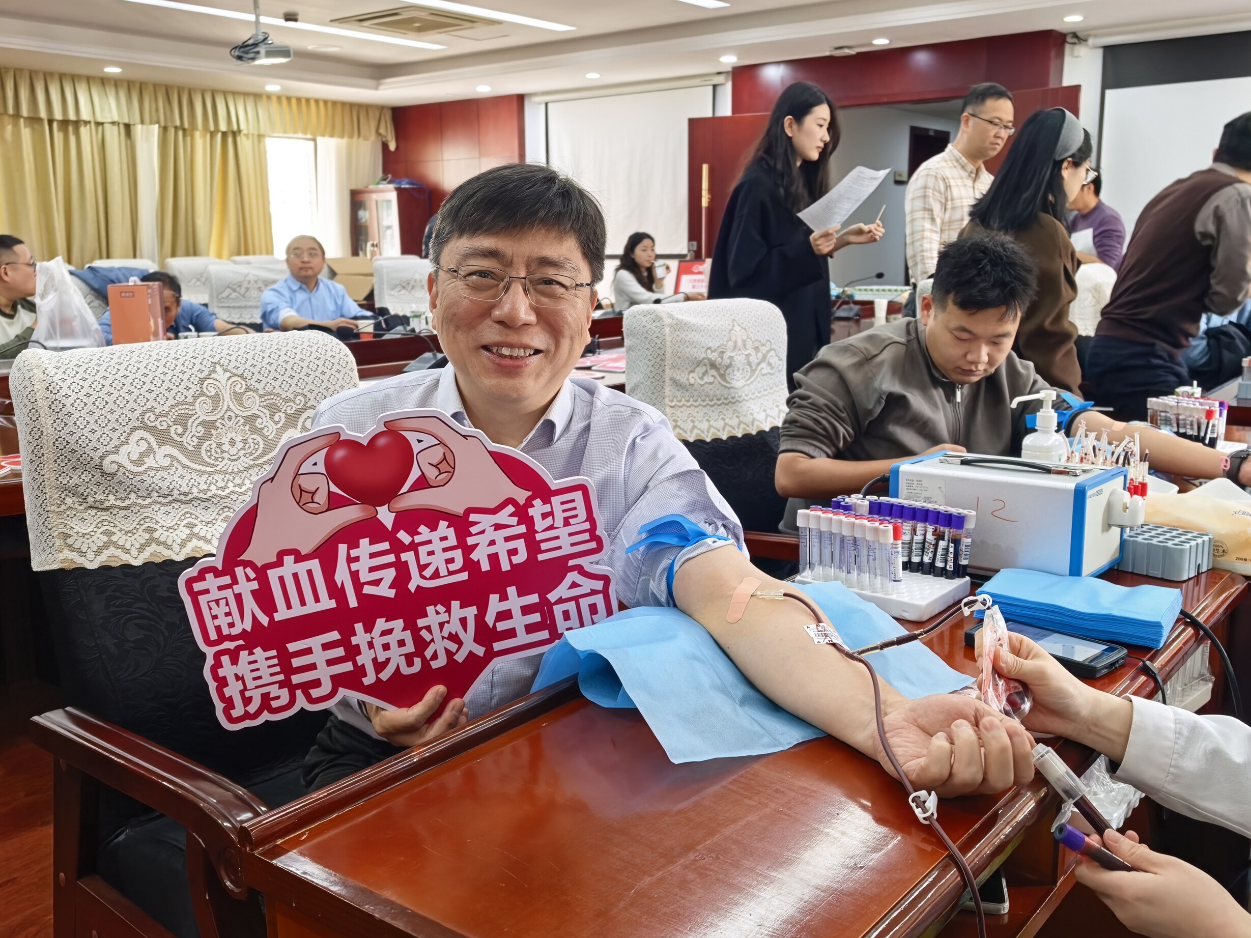 早上9点不到,西301会议室内就有序排起了长队,大家严格按照献血流程进行献血登记、测量血压、采血化验、确认合格后有序献血。有许多处室领导刚开完会便匆匆赶来献血,稍作休息后又返回工作岗位……一个个带着体温的血袋,一张张光荣的献血证,凝聚着省卫健委人的责任和担当,大家用实际行动诠释大爱无疆,传承雷锋精神。