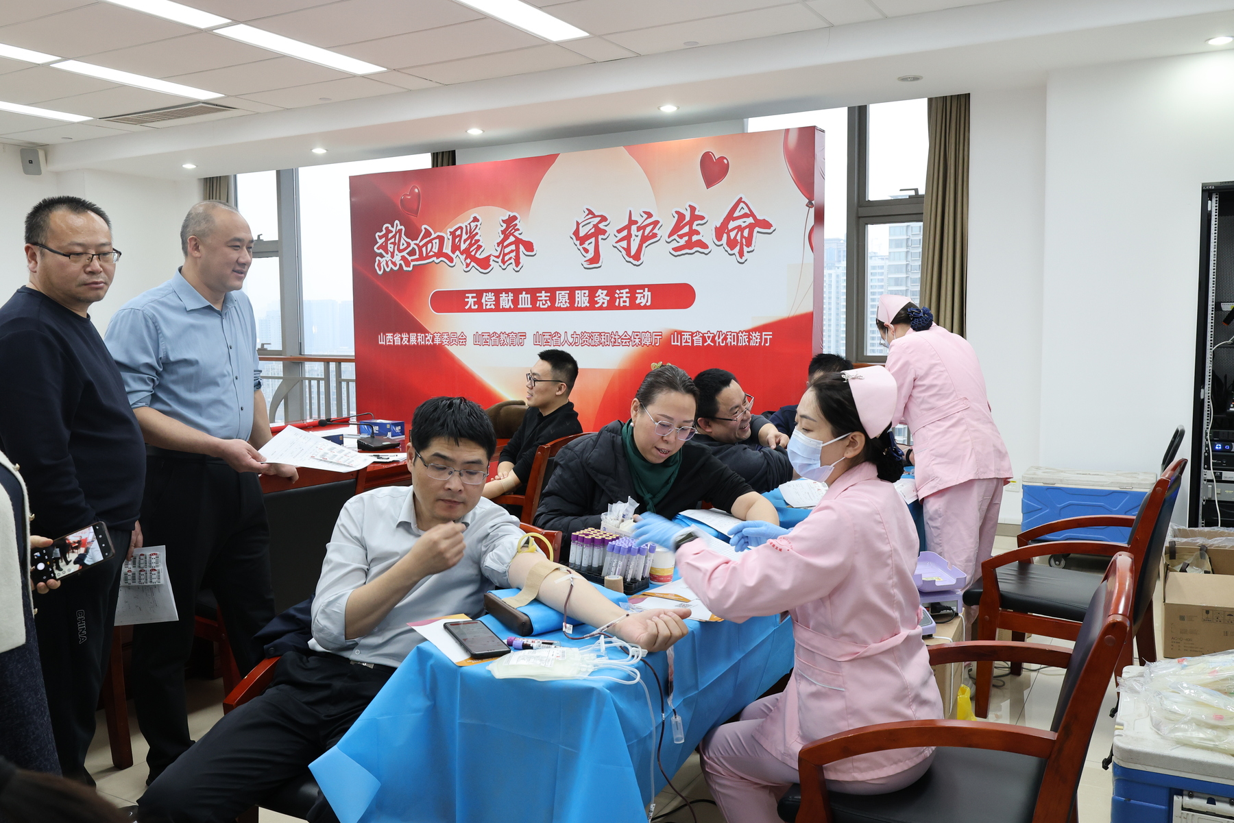 3月13日,来自山西省发展和改革委员会、山西省教育厅、山西省人力资源和社会保障厅、山西省文化和旅游厅的公务员们率先垂范,积极参与无偿献血活动。他们从办公桌走向采血椅,挽起衣袖、伸出臂膀,用实际行动诠释责任与担当,用“热血”传递温暖与希望。 本次活动共有36人成功献血,累计献血量达12900毫升。每一滴热血,都是对生命的守护;每一次奉献,都是对初心的践行。 活动主办方感谢他们积极参加无偿献血,用可以再生的血液,挽救不可重来的生命,同时也呼吁更多有爱心的市民加入无偿献血队伍!无偿献血,需要你的“一臂之力”。