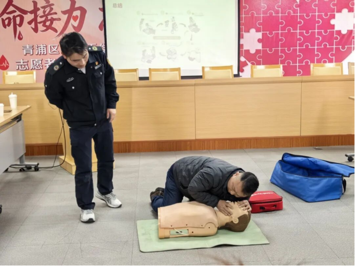 现场演示急救流程,从胸外按压到AED使用,并邀请志愿者上台实操。