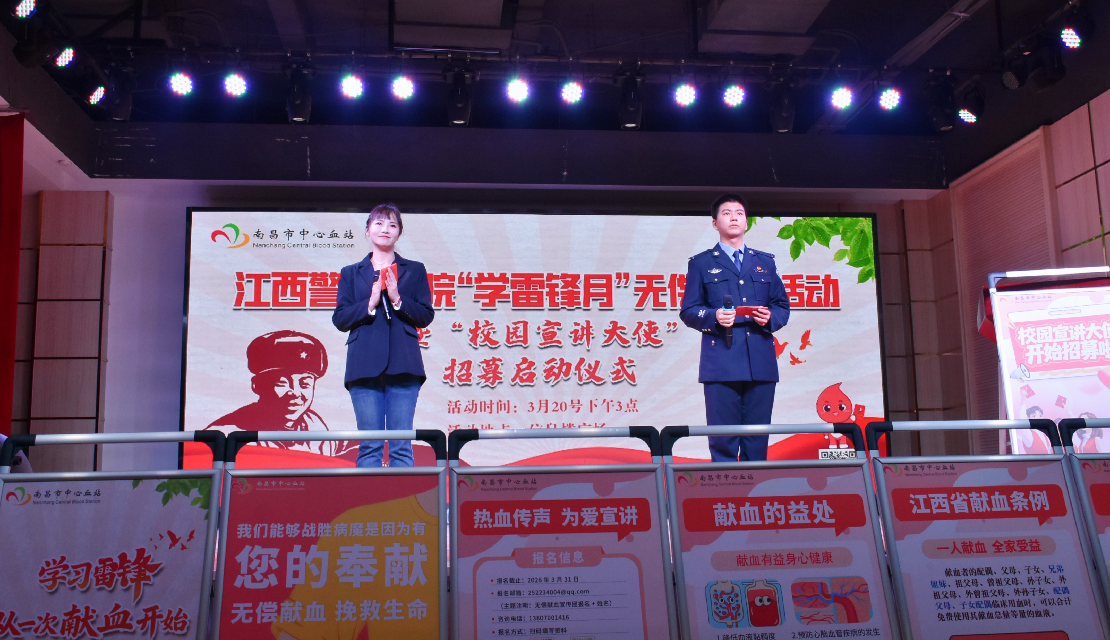 三月春风润初心,雷锋精神伴我行。3月20日下午,南昌市中心血站无偿献血“校园宣讲大使”招募首站落地江西警察学院,同步开启该校“学雷锋月”无偿献血主题活动,200名预备警官齐聚现场,以专业宣讲筑牢公益认知,以热血行动践行责任担当,让藏蓝青春与爱心公益同频共振。