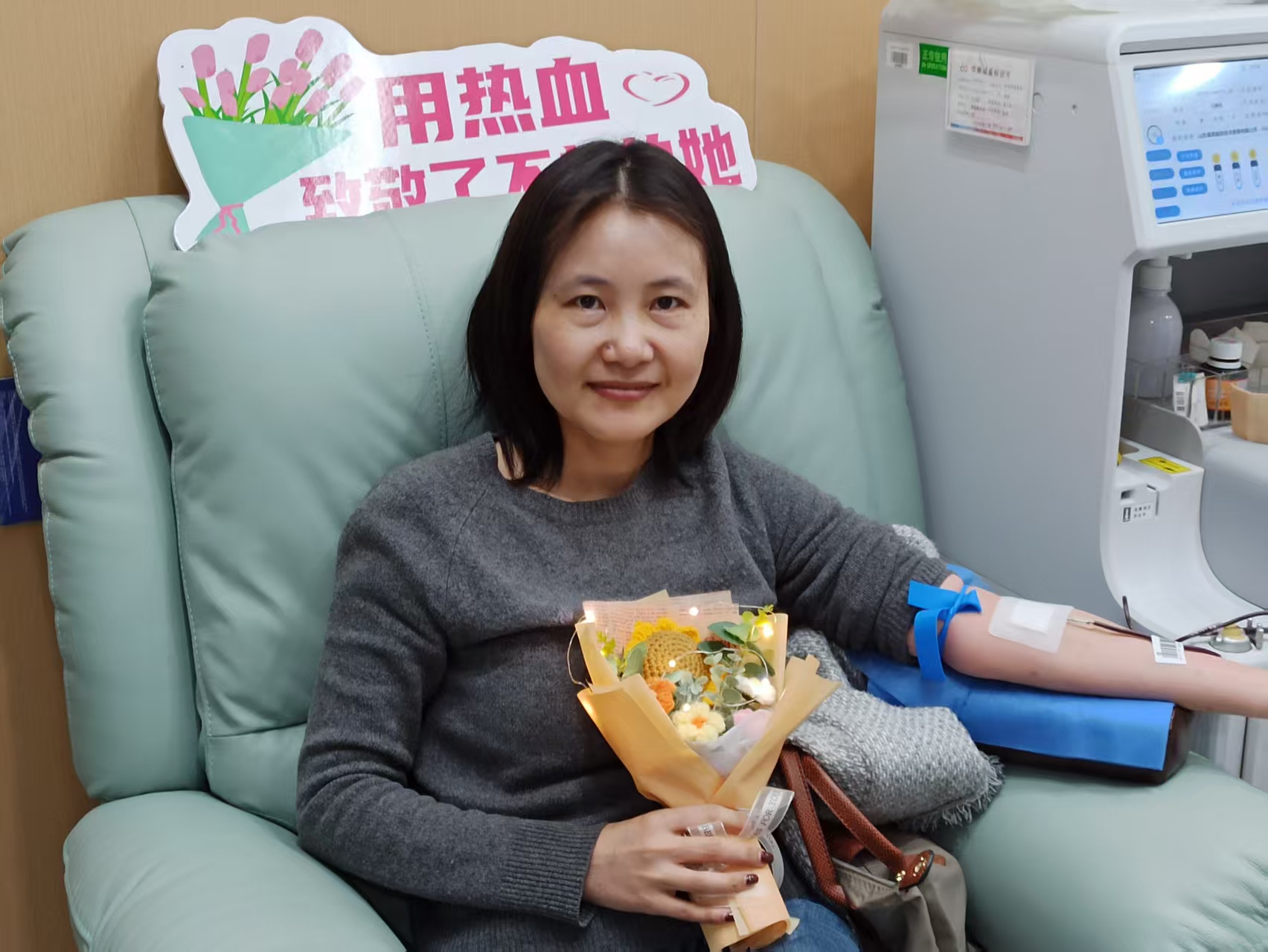 医务工作者刘女士身着白衣、心有锦缎,在节日当天来到崇安寺阿福主题献血屋挽袖献血,儿子为母亲送上花束,用童真致敬母亲的无私大爱,温馨画面令人动容。马女士可以说是崇安寺阿福主题献血屋的忠实“粉丝”,多年来她始终坚持无偿献血,献血屋迁至何处,她便追随而至。节日当天,她又一次来到献血屋奉献爱心,累计献血量已达10000毫升,用长久坚持诠释公益初心。