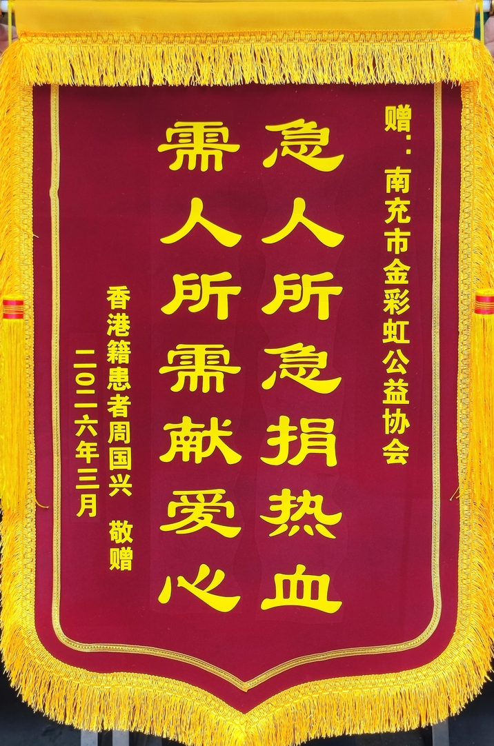 3月26日,患者侄女邓珊特意给金彩虹协会送上了一面印着“急人所急捐热血,需人所需献爱心”的锦旗。她深情表示:“姑父目前情况正在好转,我们全家都非常感激这些素未谋面的好心人。未来我们也会尽己所能,将这份大爱传递下去,支持公益事业走得更远、更光。”