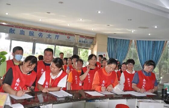(图为:南阳义工联在南阳市中心血站献血大厅组织参加无偿献血)