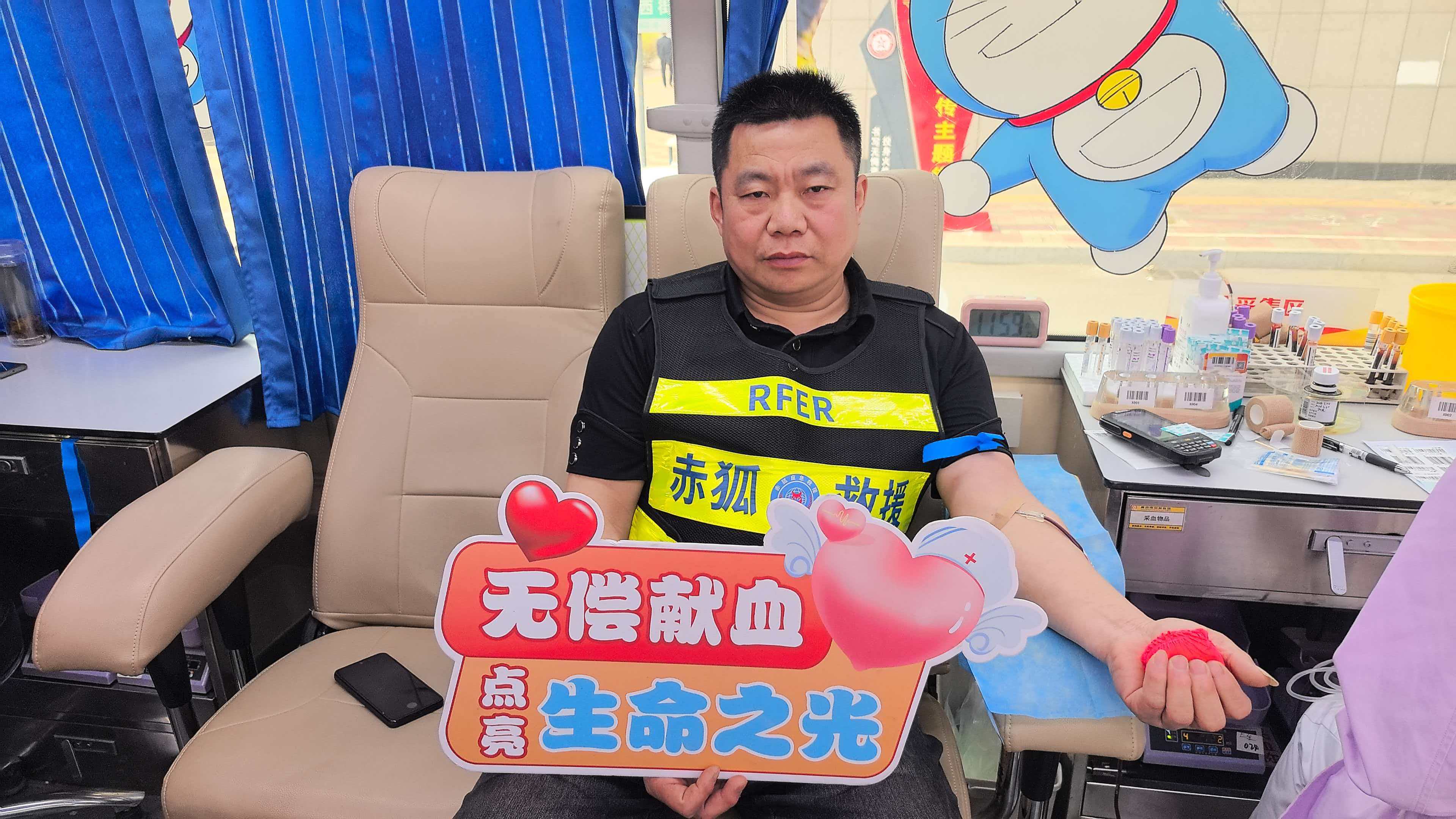 蓝天救援队李凤霞说:“平时我们身着队服,奔赴灾害现场用双手托起生命的希望。此刻,我们挽起衣袖,献出热血,用另一种方式守护生命。作为救援队员救人的初心从未改变,那一抹“救援蓝”,也可以是流淌在血管里的“热血红”。