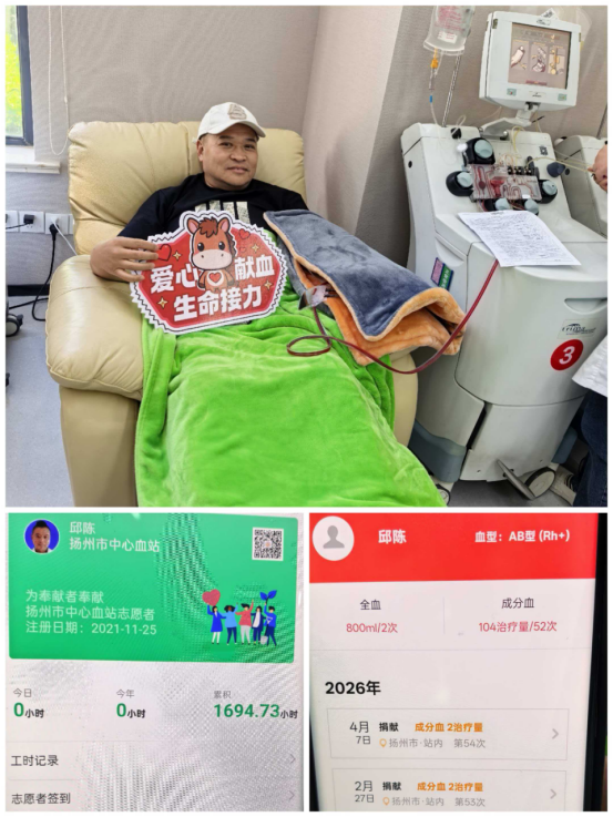 在扬州无偿献血与红十字公益领域,有一位荣誉等身的先锋人物。他集四次全国无偿献血奉献奖金奖、无偿献血终身荣誉奖、全国无偿献血志愿服务五星奖、扬州市优秀红十字志愿者等重磅荣誉于一身,用十年坚守诠释大爱,以全家同行传递温暖。他就是扬州市无偿献血红十字志愿服务队队长——邱陈。