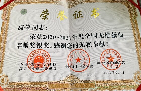 一念向善,步履不停;初心不改,久久为功。从2007年到2025年,十八载岁月流转,高荣坚守热血之约,累计献血22次,献血总量达8200毫升,源源不断为生命续航。善意不止于献血,爱心始终不断延伸。2008年,他主动加入中华骨髓库,预留生命火种,为血液病患者留存重生希望;2025年,他再次做出暖心抉择,自愿申请办理人体器官捐献登记,以生命接力的方式,诠释人间大爱,让生命在奉献中延续绽放。