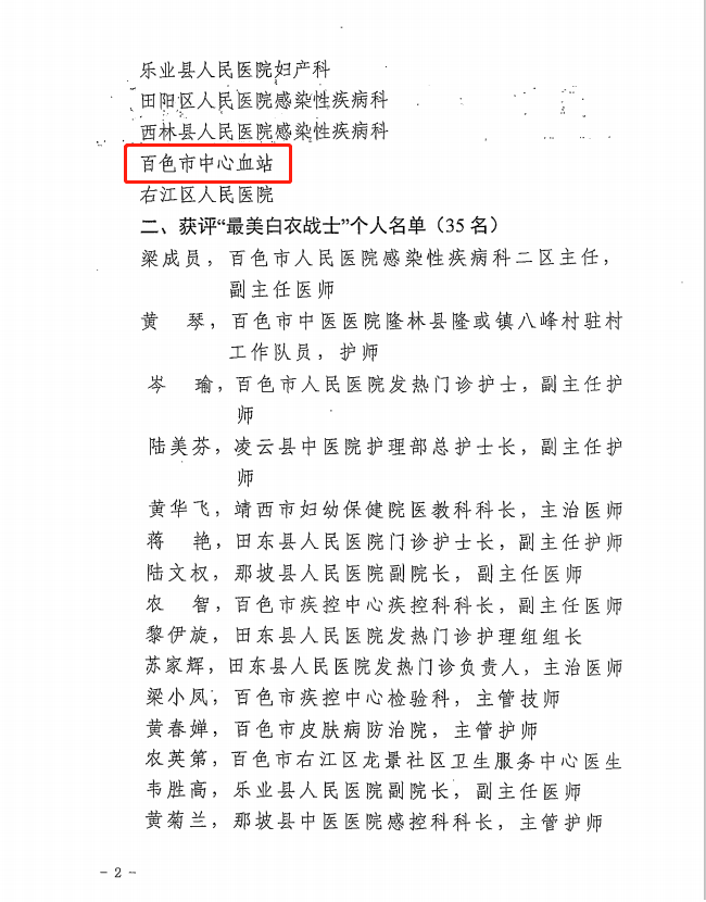近日,百色市卫生健康委员会下发《关于公布2020年“最美白衣战士”评选结果的通知》,百色市中心血站荣获“最美白衣战士”集体荣誉称号。