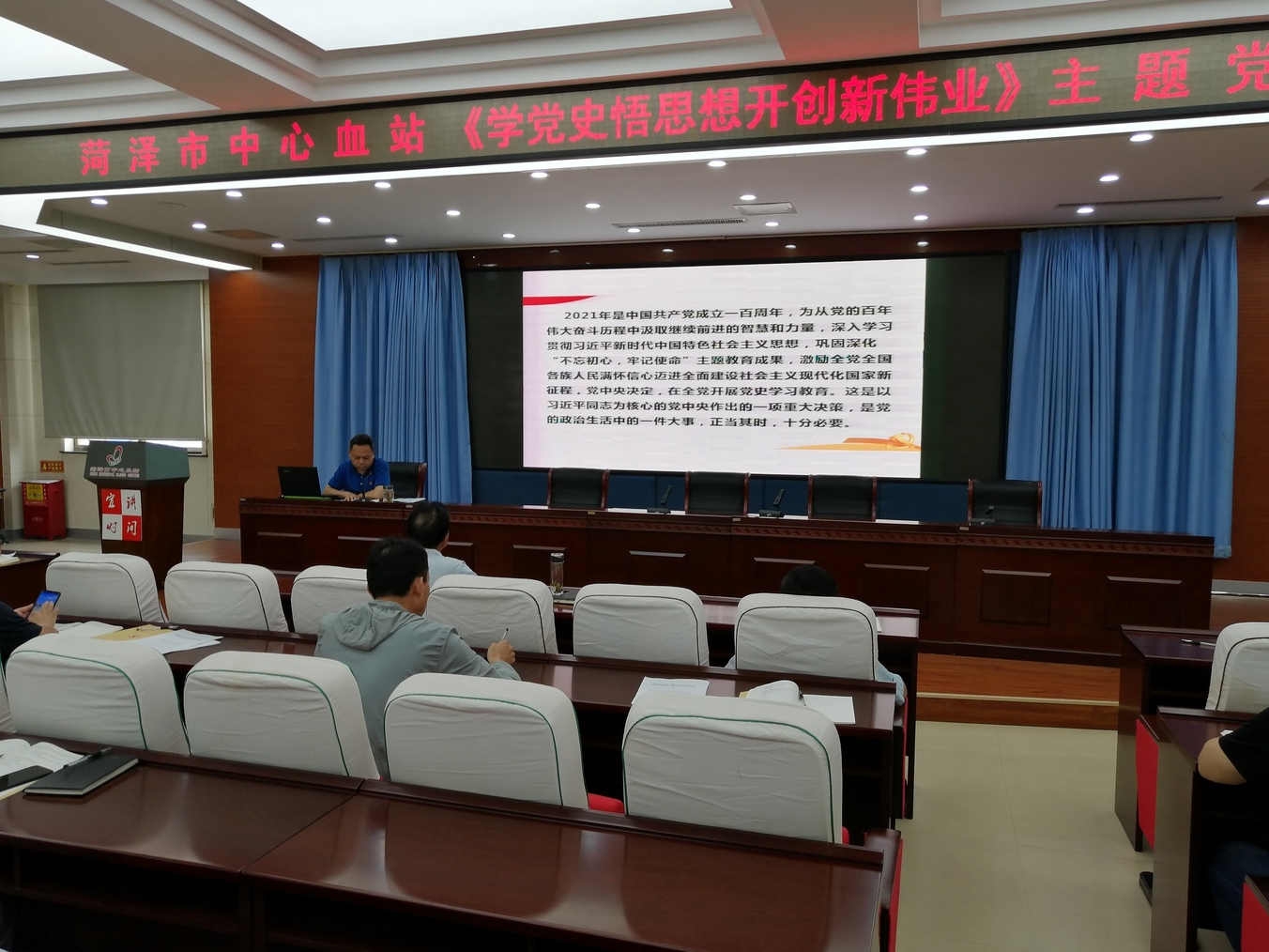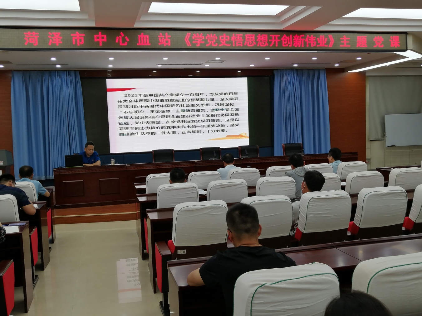 6月28日,为庆祝建党100周年,市中心血站党总支书记、站长巨昆为血站全体党员上了一堂以题为《学党史 悟思想 开创新伟业》的主题教育专题党课。血站全体党员一起聆听了党课。