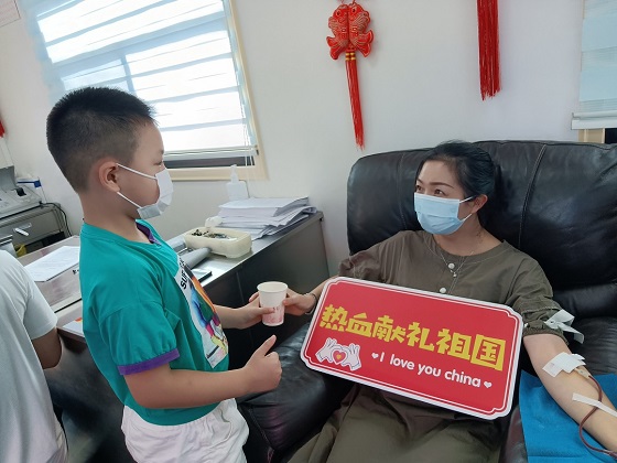 10月7日,沈俊花老师带上儿子来到了南大街爱心献血屋。看着鲜红的血液缓缓流入血袋,她激动地说:“一人献血,全家光荣,趁着国庆假期献一份爱心,给孩子做个榜样,也是给儿子上了一堂爱国、公益双教育课。”陪同献血的儿子给妈妈竖起了大拇指,年龄尚小的他对献血的意义似懂非懂,但他知道妈妈在做一件了不起的事情,妈妈是个献血英雄!