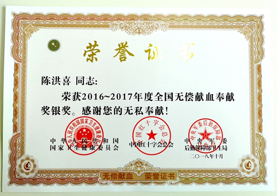 不知不觉中,我已经连续22年参加无偿献血,累计献血23次总量已达7200毫升,先后荣获全国无偿献血奉献奖铜奖和银奖。这是我人生中最值得自豪的一件事,也是多年来荣获的诸多荣誉中,含金量最高和倍感珍惜的至高荣誉。
