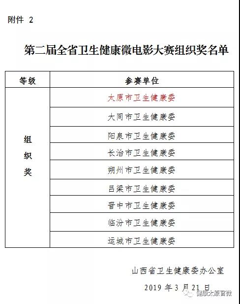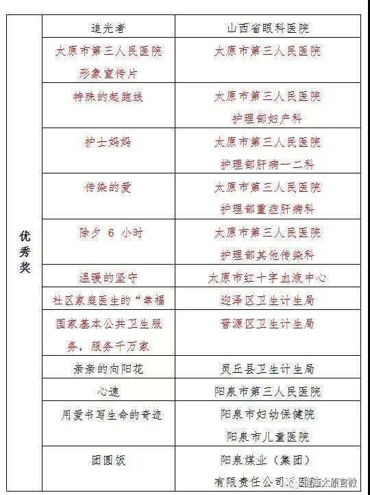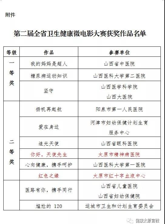 近日,山西省卫生健康委员会正式对外发布第二届微电影大赛评选结果。经专家评审和群众评议,太原市红十字血液中心的《红色之缘》和太原市精神病医院的《你好、天使先生》2部作品荣获二等奖;迎泽区卫计局、市第三人民医院等报送的8部作品荣获优秀奖。太原市卫生健康委荣获第二届山西省卫生健康微电影大赛组织奖。