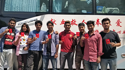在献血的人群中,有一群留学生也在填表排队参加无偿献血活动,尤其引人注目。经了解,他们是来自孟加拉国的留学生,来到中国都在一年以上。首先登上献血车的是Shahriar,他来中国已经三年了,说着一口流利的普通话,他率先进行登记填表经检验合格后成功捐献出300毫升血液。在活动中,他充当翻译的角色,积极帮助工作人员与其他留学生进行沟通交流。Shahriar说道:“献血真的是一件很棒的事情,在我们孟加拉国每4个月就可以捐献一次,我们同学中有几位在国内曾经捐献过,今天我们看到这里有献血活动,所以也就过来参与了。我们刚到中国时,语言交流也比较困难,很多事情都不熟悉,但是好心的中国朋友给予了我们很多帮助。今天我要用自己的血液去帮助那些需要输血治疗的病人,以此来感恩回馈我们中国的朋友,让这份爱继续传递下去。”