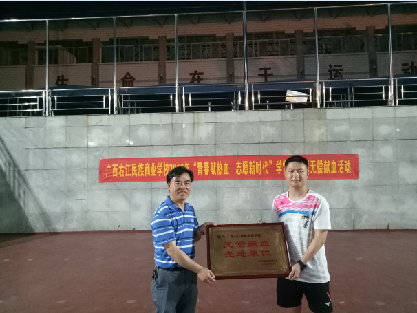 广西右江民族商业学校一向重视无偿献血工作,把无偿献血作为培育学生积极践行社会主义核心价值观的重要途径来抓,被百色市公民献血委员会授予“2018年百色市无偿献血先进单位”荣誉称号。