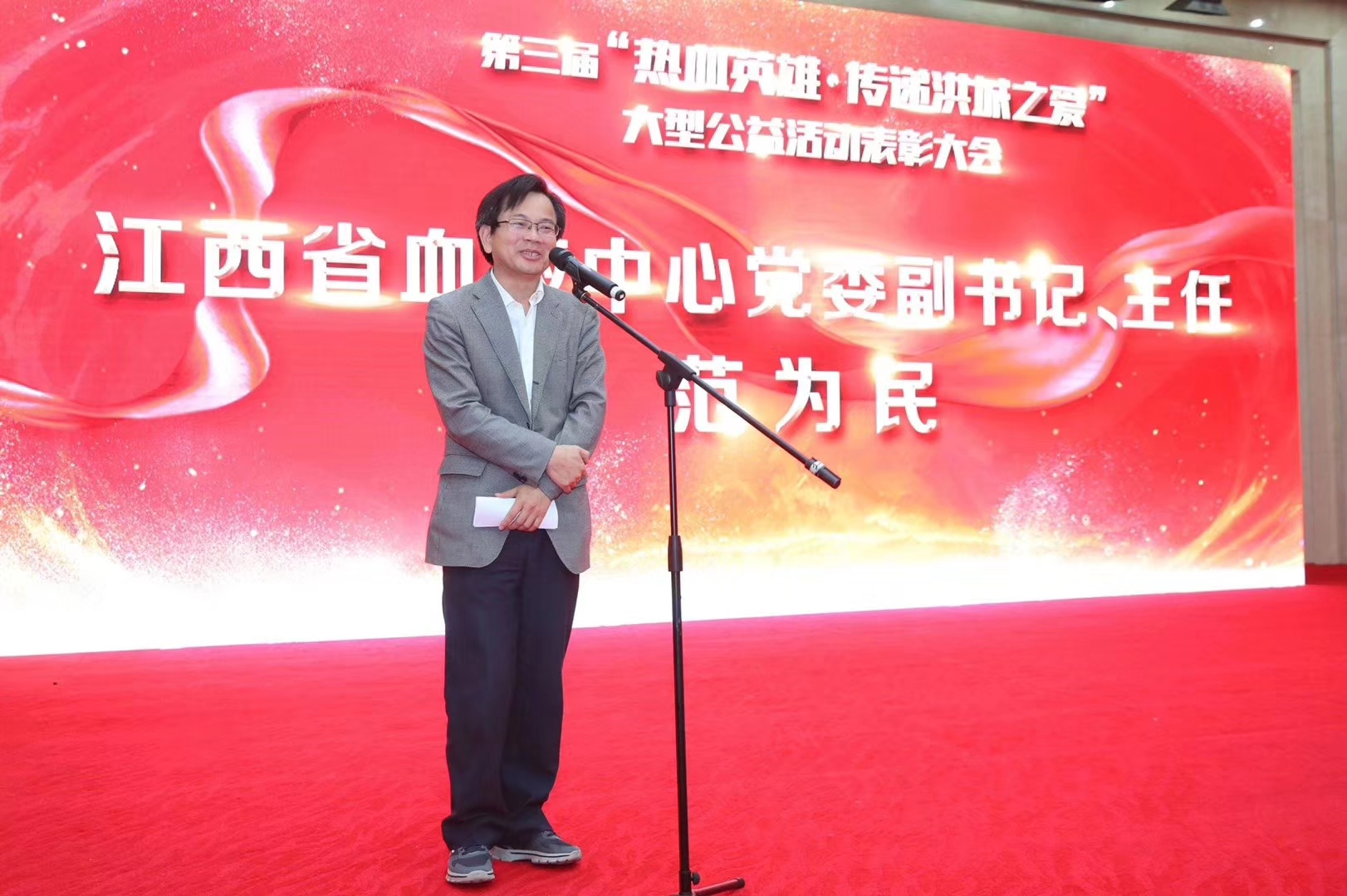 江西省血液中心党委副书记、主任范为民参加活动,并为受表彰者颁奖。颁奖仪式上,范为民深受感动,在总结发言时即兴赋诗一首,题为《热血颂——致敬无偿献血者》,现场掌声雷动。