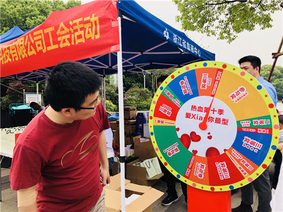 热血十载,与爱同行。2019年4月21日上午11点,浙江省血液中心联合杭州乐港科技有限公司、西湖区文新街道党工委办事处、古荡街道总工会、聚心公益在西城广场举行了“热血第十季 爱xian你最型”——2019年乐港周年庆献血活动。