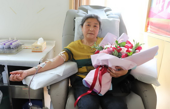 河南省红十字血液中心工作人员为叶淑华阿姨送上鲜花表示感谢及祝贺