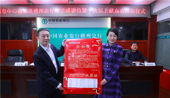 (郴州市中心血站副站长史艾娟向农行郴州分行授予感谢信)