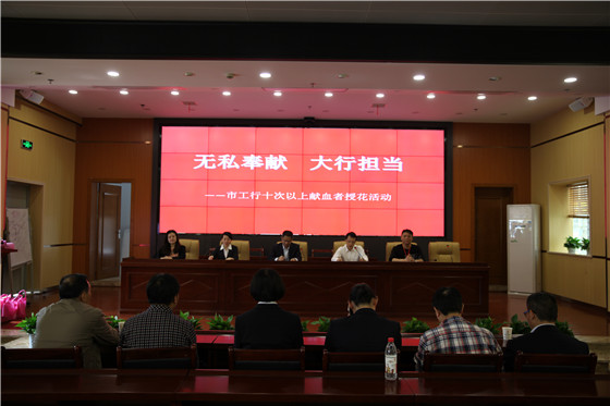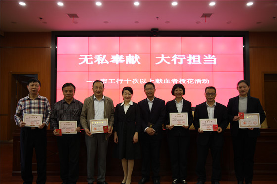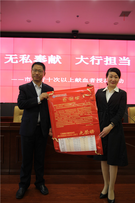 活动现场,郴州市中心血站副站长史艾娟向市工行致感谢信,并同市工行纪委书记、工委主任周济书一道,为献血者颁发荣誉证书,向献血者授花。
