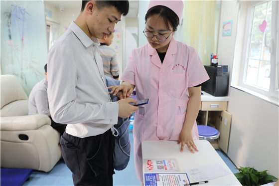 (护士指导员工献血后关注郴州市中心血站微信公众号,届时查询献血结果)