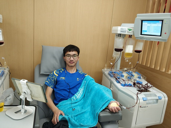 侯德学是一名大二的学生,不要看他年纪轻轻文质彬彬,但他从大一开始已经参加了24次成分血捐献。母亲节来临之际他也抽空来献了1.5个治疗量,他说:“母亲节不能亲自回家陪伴母亲,就用献血的方式对远方的母亲表达思念和节日的祝福,也祝天下所有母亲健康平安!”