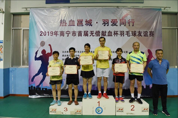 5月11日、12日,2019年南宁市首届无偿献血杯羽毛球友谊赛在南宁中心血站献血者之家二楼球馆火热开赛,共有392位献血者参加比赛,他们在球场上挥洒汗水,切磋球技,充分展现了献血者健康、积极向上的精神面貌。经过激烈角逐,麦家武、邓彬、刘毅、周晓霜、韦月荣、韦洁媚等分别摘得本次比赛各组别冠军。