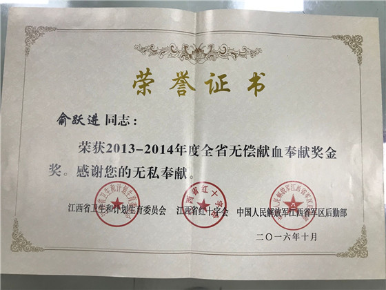 在连续17年的献血历程中,俞跃进共计捐献血液28次,累积献血量达11200毫升。由于在无偿献血工作上作出的突出贡献,他曾先后获得过全国无偿献血奉献奖金、银、铜奖,江西省无偿献血奉献奖金奖,以及当地特别为他颁发的“上饶市无偿献血特别奉献奖”等奖项。