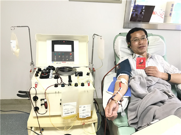 5月14日上午,来中心捐献血小板的爱心市民络绎不绝,护士们都在马不停蹄地忙碌着。忙碌间一抬头看到一张熟悉的面孔,原来江苏省红十字会造血干细胞捐献管理中心的丁玉琴主任今天再次来爱心献板了,交谈中得知她今天是特地陪同事黄国华一起来捐献血小板。丁玉琴主任自2012年首次捐献成分血至今已累计捐献血小板9个治疗量,全血1500毫升。在她的言传身教下,从未献过成分血的黄国华,对于单采血小板有了初步的了解,今天相约一起来勇敢献板。黄国华是个非常有爱心的医务工作者,几年前因工作调动来到省红会工作,了解到捐献造血干细胞能救治重症病患后,他立即决定登记留样加入中华骨髓库,无奈因年龄超过登记要求后未能如愿,从此他就以无偿献血、挽救病患的生命为己任。经体检、初筛,各项血液检测指标刚好符合捐献单份血小板的要求,他勇敢地捐献了1袋带着体温的血小板。
