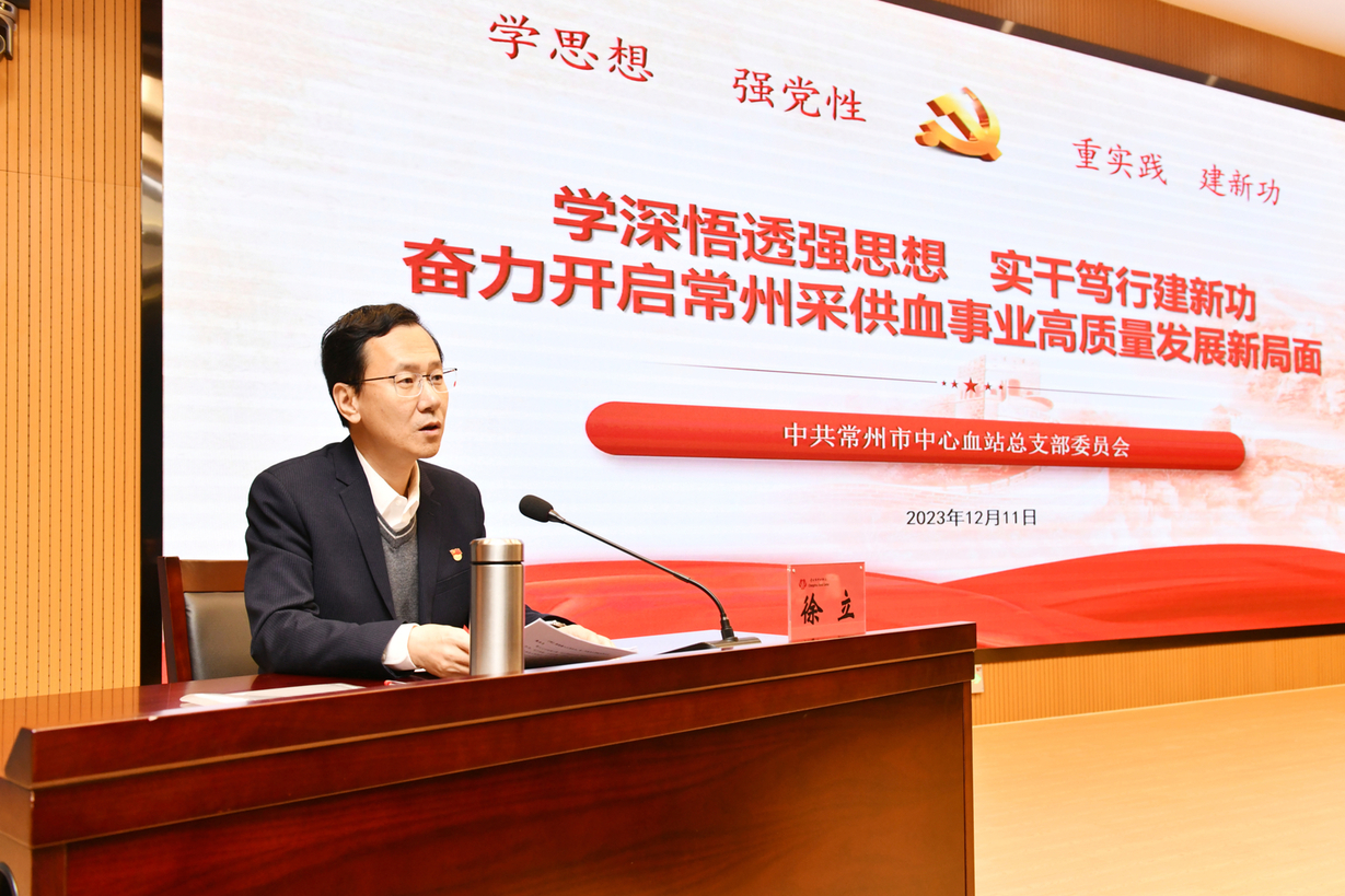 12月11日,常州市中心血站党总支书记、站长徐立以“学深悟透强思想 实干笃行建新功 奋力开启常州采供血事业高质量发展新局面”为题讲授专题党课。