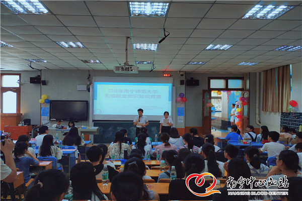 为进一步普及无偿献血知识,加深同学们对无偿献血知识的认识,消除对于无偿献血的误解,号召更多的高校学子加入到无偿献血队伍中来,南宁中心血站联合南宁师范大学团委于5月19日在该校举行了“我为青春献热血”无偿献血知识竞赛。来自南宁市无偿献血志愿者协会的代表、南宁师范大学各学生社团代表、参赛代表等共200人参加了此次活动。