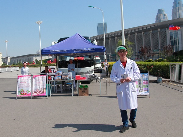 上午10点,太阳就已经开启暴晒模式,在天津站出行的人们纷纷选择从地下通道通行,诺大的广场上人迹寥寥,行色匆匆。最显眼的就是血液中心的采血车和站在烈日下招幕的医护人员了。