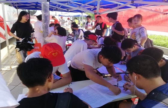 随着11:40下课铃声的响起,活动现场的遮阳帐篷下逐渐聚集了许多前来献血的同学们。其中,多次献血的同学们也不在少数,同时也有很多下课便急匆匆赶来的同学。正午的气温渐渐闷热了起来,但同学们火热的爱心让他们顾不上酷热,一个个都坐在花坛边填写起了“献血登记表”。