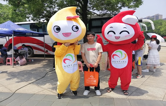 午饭后,献血活动迎来了一个小高峰。同学们把献血点围得密不透风。来自校青志协会的同学们穿上血宝宝人偶装,虽然有些闷热,很辛苦,但他们也为活跃献血氛围起到了至关重要的作用,不少同学们都被这可爱的血宝宝吸引,纷纷在献完血后与他们合照。给志愿者同学们点赞!