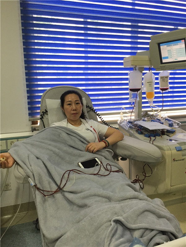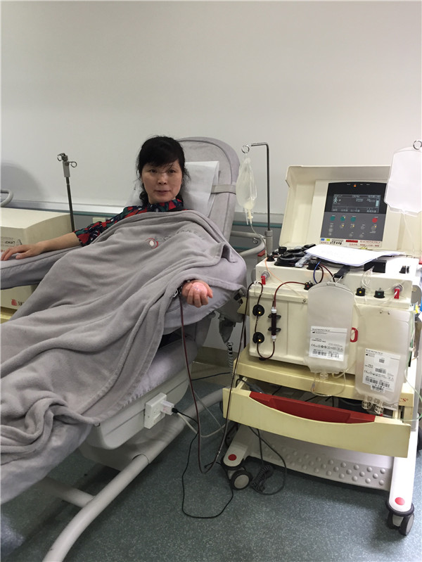 5月27日,天空下起了蒙蒙细雨,可能是天气的原因,这天江苏省血液中心机采大厅没有往日那么忙碌,上午机采大厅来了我们的一位“老朋友”陶文平和她的两位同事周童兰和马于婷。陶文平自2005 年开始献血以来至今已累计献血112次,3200毫升全血,114个治疗量的血小板。她平时自己都会定期献板,也会向身边的朋友同事讲解无偿献血的知识,恰巧今天三人都休息就相约前来一起献板。由于当天“A”型血小板需求已满,陶文平没有捐献成功,周童兰和马于婷分别成功捐献1个治疗量和2个治疗量血小板。