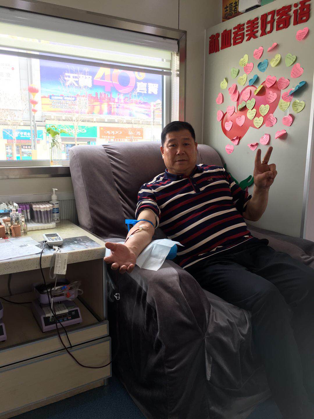 今天是一个特殊的日子,这是他最后一次捐献血液,年满60岁的他,已达到献血规定的最高年纪。 看着缓缓流出的血液,马振斌一脸的不舍。我安慰他:“没关系呀!因为无偿献血,我们已成了朋友,以后路过时也可以到车上坐一坐,喝点热水,看看我们。”“那是肯定的,我会常来看你们的。就是不能再用自己的热血去帮助别人,有些遗憾。”