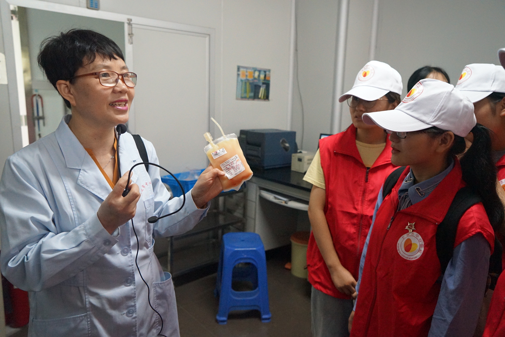 讲解员带领大家了解血液的制备、检验、存储、发放等流程,让大家了解到,捐献出来的血不是直接输入人体,而是需要严格的制备和检验等环节才能将安全的血液送往医院。