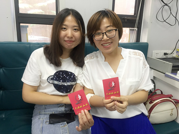 任彤彤和梁健美都是硕士研究生,分别就读于南大和科大,二人是本科同学,端午小长假她们相约一起献血来度过这个假期。任彤彤是第一次献血,她说她对献血充满了期待,她说,她觉得献血是一件既利他又利已的事儿,能帮助别人感觉真好,就把它作为送给自己研究生的毕业礼物吧!梁健美已经是第二次献血了,她说,她本科的时候就献过血了,她现在有个小目标,就是毕业后将把献血作为自己的一个常规活动,刚听采血护士说,半年可以献血一次,她希望自己可以一直坚持下去,这样就可以救助更多的人。