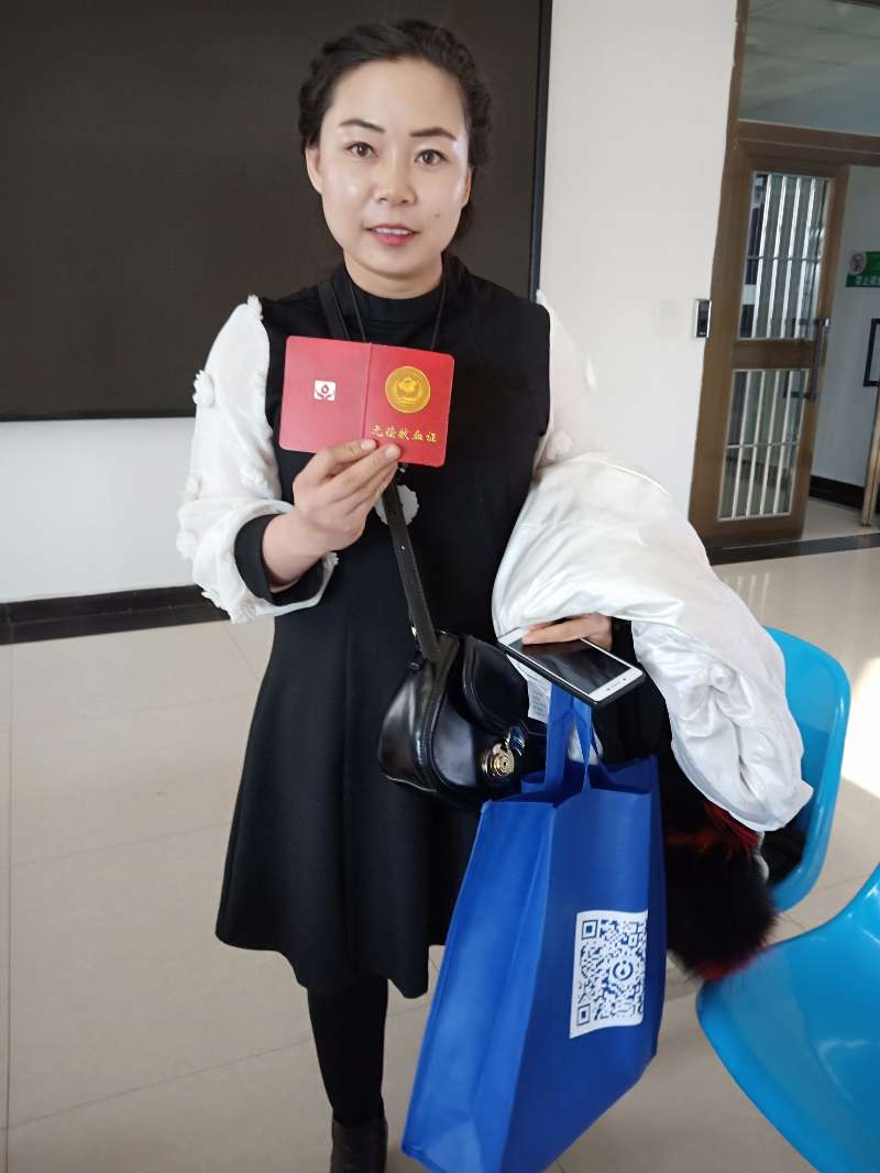 马阿社,昌吉大西渠镇回族女子,3月6号,我站采血车在大西渠镇组织采血活动,几天前她的身份证丢失了,可是按照规定,第一次献血是必须要出示身份证的,经工作人员提示,马阿社赶到了社区警务站,专门儿打印了身份证信息,又赶回镇政府的采血车上,终于成功献血 ,这不,拿上献血证后的她开心地笑了。