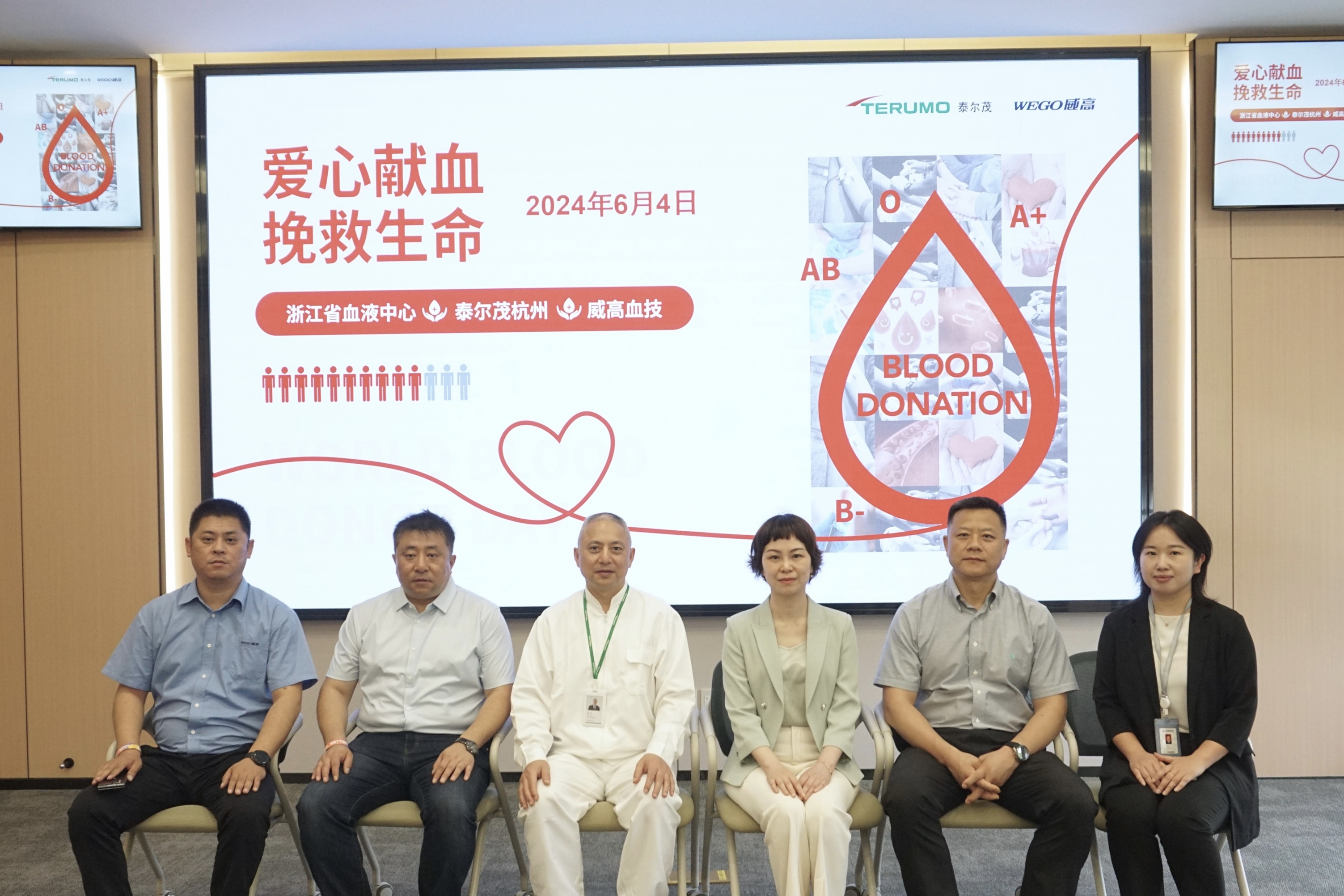 6月4日,泰尔茂杭州与威高在杭州共同举办主题为“爱心献血、挽救生命”无偿献血活动。浙江省血液中心副主任潘凌凌、泰尔茂杭州总经理张炎、威高血技总经理于鹏飞、威高海外总经理张勇出席无偿献血启动仪式。