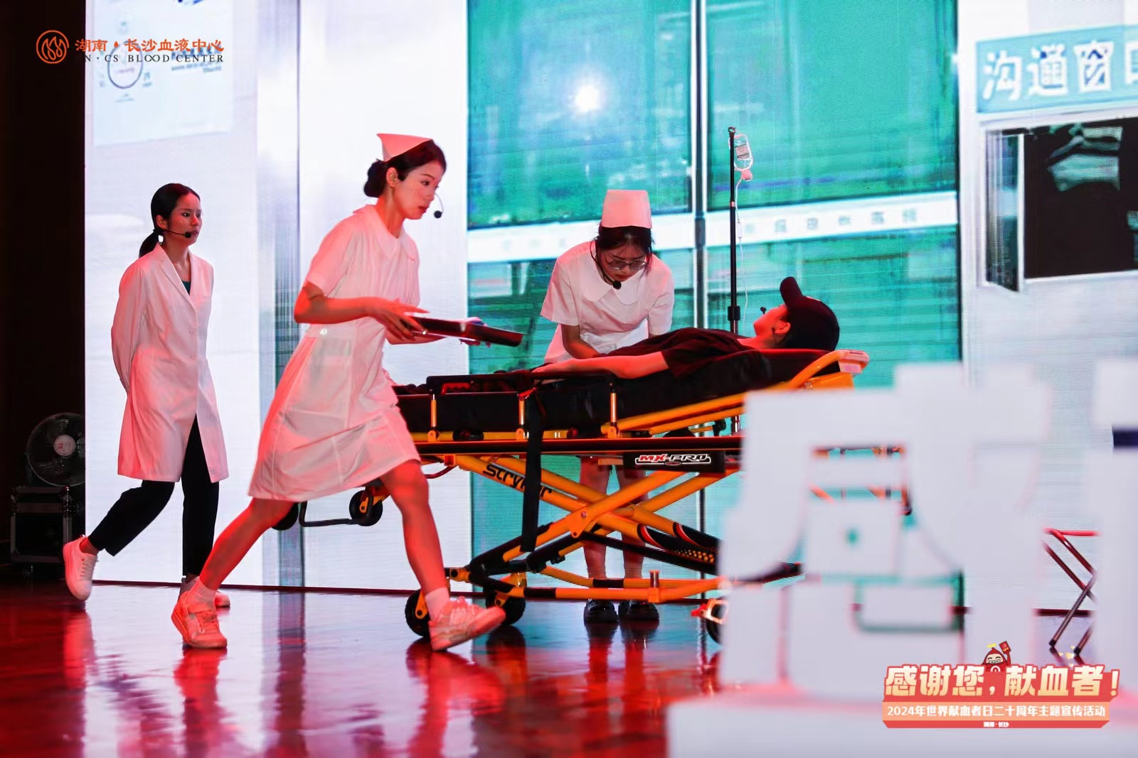 “首演”——无偿献血主题热血秀《血·缘》。《血·缘》作为湖南省首台无偿献血主题热血秀,在此次活动上进行了首次公开演出,该剧用TED分享、情景剧、舞剧、朗诵剧等方式,演绎了一名血液病患者接受急救的故事,从受血者、献血者、血液中心工作人员三个维度再现了一场用血液拯救生命的“接力赛”,高度还原的场景、真情实感的演绎,将现场观众带入紧张、感动的剧情之中。