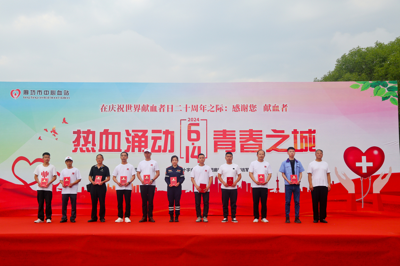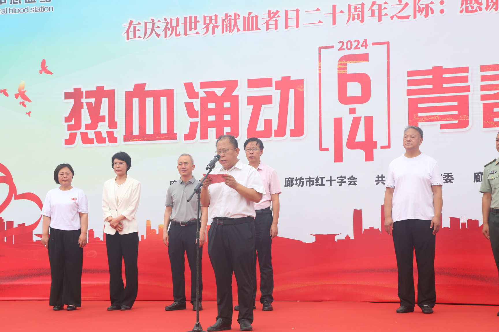 2024年6月14日是世界献血者日20周年,为感谢献血者的无偿献血行为,弘扬救死扶伤人道主义精神,保障临床用血供应,6月14日上午,市卫生健康委、市红十字会、共青团市委、军分区保障处联合举办“热血涌动 青春之城”2024年廊坊市世界献血者日20周年主题宣传活动。廊坊市政府副市长张春燕,市政府副秘书长于彦彬,市卫健委党组书记、主任李庆辉,到现场看望慰问献血者、志愿者和医务工作人员。