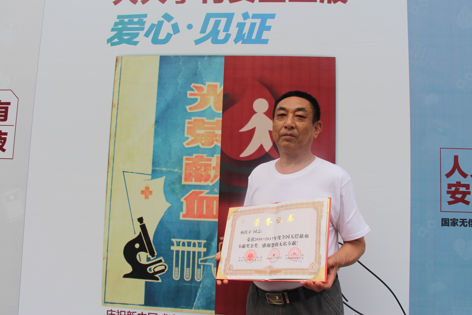 全国无偿献血奉献奖金奖获得者,杨跃章:从1998年无偿献血以来,我累积献血量达7.3万毫升,献血次数为170余次。我第一次献血,其实是一次偶然。当时提起献血,身边有不少质疑的声音:献血会导致头晕。一次出差途中,我在一份报纸上注意到一个信息:“血库血液紧缺”,回家后我就瞒着家人去进行了第一次无偿献血,打破了原有的顾虑。我的家人和身边的朋友也通过我无偿献血,从质疑转变到成为了一个个无偿献血者。 特别是我的孩子,在他十八岁生日那天,我带他去进行了无偿献血,给了他一个“特别”的成人礼。