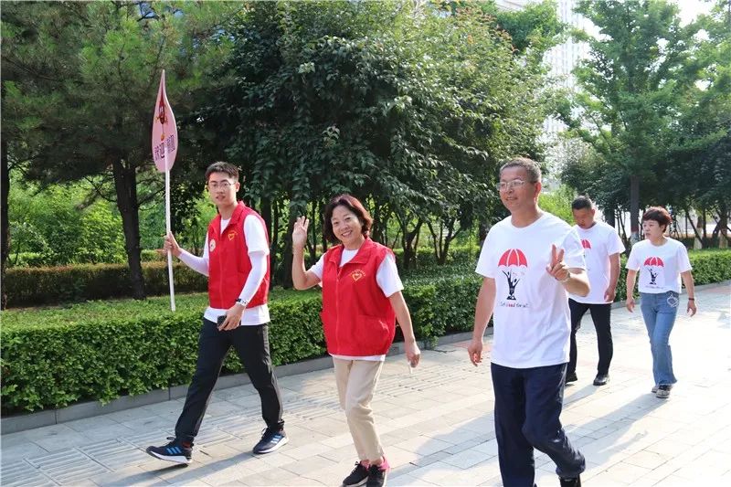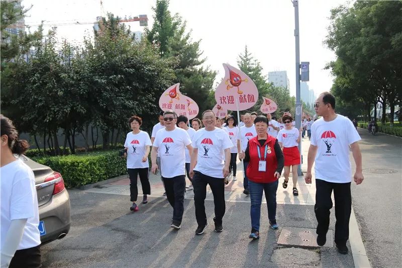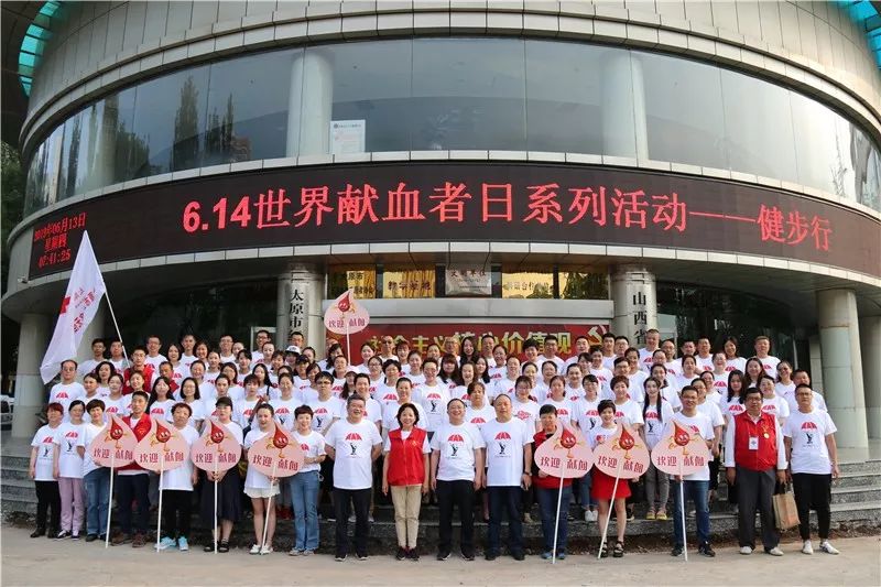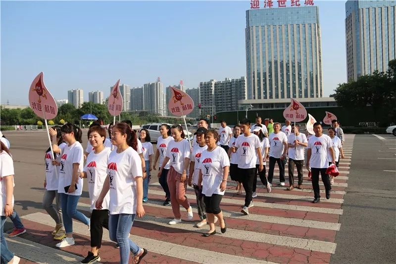 血液中心职工、志愿者们身着6·14主题T恤或红马甲,手持“欢迎献血”手举牌,由血液中心出发,步行至迎泽西大街西客站后返回中心,在健步行的同时宣传无偿献血。