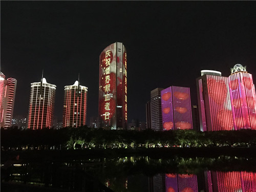 6·14世界献血者日当晚,海口湾高楼幕墙景观灯亮起了绚丽的灯光,那是属于无偿献血者的灯光。滚动播放着的爱心和字幕组成的灯光秀,一遍又一遍地向无偿献血者致敬,致敬他们的爱心,致敬他们为“人人享有安全血液”所做出的努力和贡献!