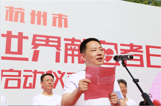 仪式上,杭州市民卡有限公司高新华副总经理致辞。同时,即日起杭州地区换证工作已全面启动,献血者可携带旧版“三免”荣誉证到下沙服务点、滨江服务点、拱墅服务厅、城西服务厅、城北服务厅、市民之家服务厅、城南服务厅这7个点免费换证。