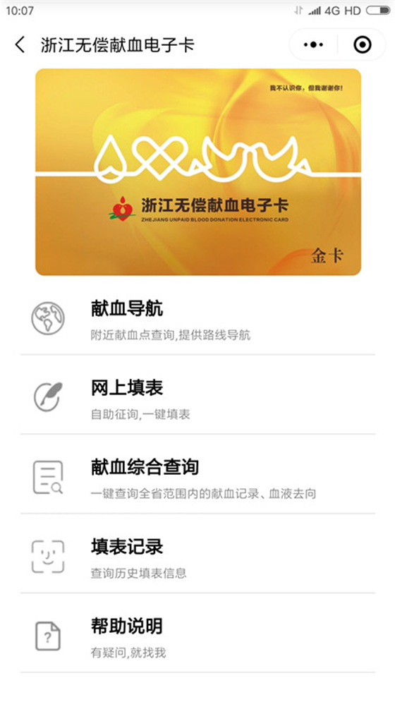 那么,问题来了,大家要如何领取这张电子卡,这张卡又有哪些功能呢?您只要关注“浙江省血液中心”官方微信,点击右下方菜单栏“电子卡”,即可申领。成功领卡后,献血者即可享受一键查询全省献血记录、血液去向、智能献血导航、网上自助填表等诸多实用功能。您还在等什么,赶紧打开您的微信,动动手指,享受领卡体验吧!